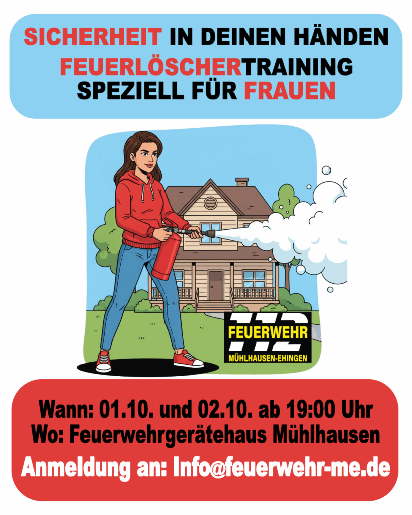 Mehrere Frauen aus unserer Gemeinde haben bereits ihr Interesse bekundet, den sicheren Umgang mit Feuerlöschern zu erlernen. Aus diesem Grund bietet die Feuerwehr Mühlhausen-Ehingen allen Frauen aus der Gemeinde die Gelegenheit, an einem speziell ausgerichteten Feuerlöschertraining teilzunehmen.