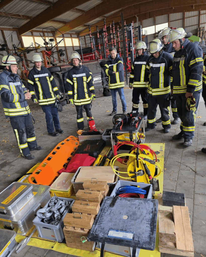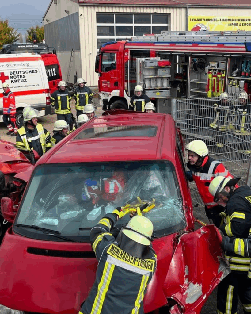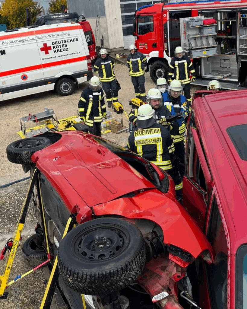 Ein ganzer Tag voller Übungen Am Samstag den, 25 10.25 führte die Feuerwehr Mühlhausen-Ehingen einen Tag der Technischen Hilfeleistung durch. Die Vorbereitungen hierzu liefen schon Monate voraus an. Um 10 Uhr traf man sich, um zusammen zur ZG-Technik zu fahren, welche uns freundlicherweise ihre überdachten Hallen für den Tag ausräumte und zur Verfügung stellte. Dies erwies sich im Laufe des Morgens als absolut hilfreich, denn es fing an in Strömen zu regnen. An 3 Stationen konnte eine einfache Fahrzeugöffnung, eine große Seitenöffnung sowie das Stabilisieren mit dem Stabfast geübt werden.