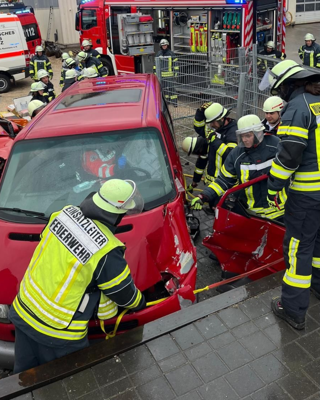 Der Höhepunkt bildete dann bei der Fa. Nester eine überraschende Abschlussübung, wo 2 weitere Fahrzeuge „vorbereitet“ waren. Alle Beteiligten hatten im Vorfeld keine Ahnung, was auf sie zukam. Zusammen mit Notarzt Michael Woll und seinem Rettungsteam, vorbereitet von seiner Frau Katharina sowie Fabian Schoch vom Ortsverein Engen, wurde dann die Zusammenarbeit sowie die Abstimmung der Hilfsorganisationen geprobt. Unter realen Bedingungen und unter Abstimmung mit dem Notarzt, galt es 2 Personen aus den Fahrzeugen zu befreien. Im Anschluss wurde dann das Erarbeitete gemeinsam besprochen und analysiert.